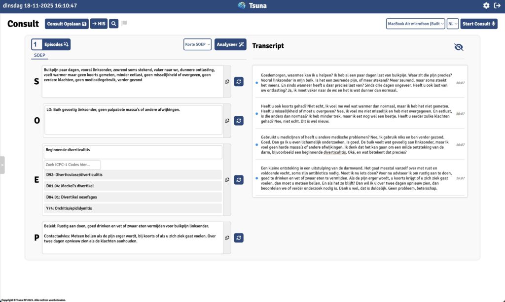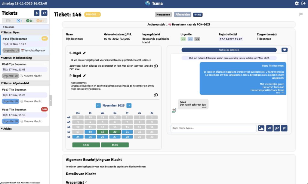 Met Tsuna, de Digitale Doktersassistente, kunnen patiënten 24/7 hun zorgvraag indienen. Bij medische klachten doorlopen zij een triage op basis van de NHG Triagewijzer, geven hun beschikbaarheid door en formuleren hun hulpvraag. Onze AI zet dit om in een duidelijke S-regel en overzicht voor de assistente.